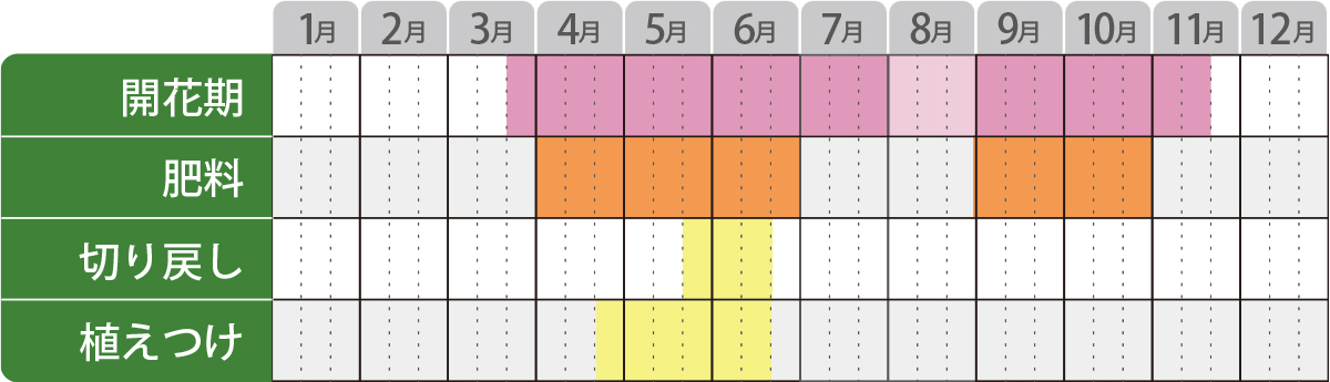 ※関東地方以西低地基準になります。地域やその年の気候、生育状態により、開花期やお手入れの適期などは変わります。栽培カレンダーは目安としてください。