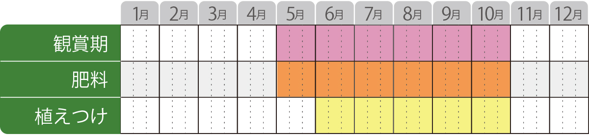 ※関東地方以西低地基準になります。地域やその年の気候、生育状態により、開花期やお手入れの適期などは変わります。栽培カレンダーは目安としてください。