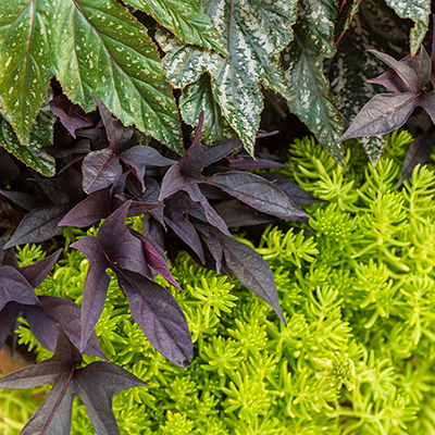 イポメアは、鮮やかなライムから深みのあるパープル、シックなブラックまで、多彩な葉色が楽しめる観賞用サツマイモ。暑さに強く旺盛に茂るため、夏のガーデンシーンに豊かな表情とボリュームをもたらします。