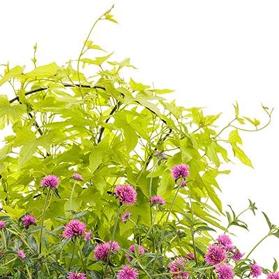 イポメア「モリーナ」は、発色のよいライムグリーンの葉が主役級のカラーリーフ。花ものと合わせるだけで全体が明るくまとまり、寄せ植えの引き立て役にも、アクセントにも使える万能タイプです。高温期も元気に育ち、夏の長期間ディスプレイに向きます。