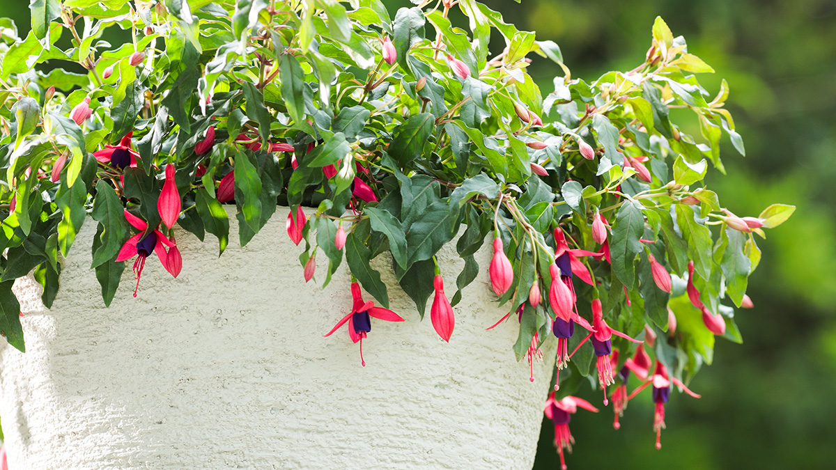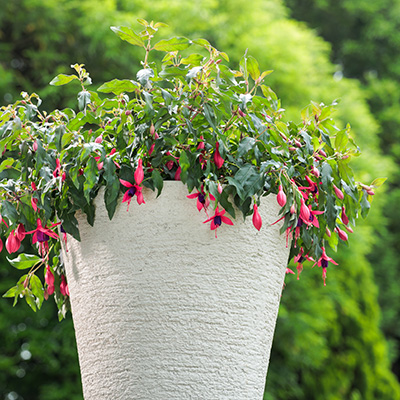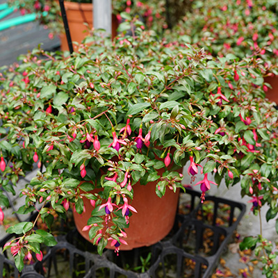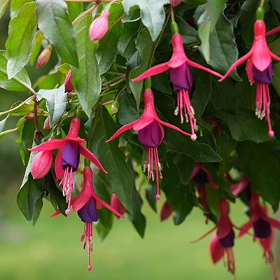 暑さに強く、春から晩秋まで次々と花を咲かせる這い性フクシア。下向きに揺れる可憐な花姿は“貴婦人のイヤリング”のよう。鉢・ハンギング・花壇に幅広く使え、ボリュームよくまとまります。夏は強い直射日光を避け、風通しのよい涼しい場所で管理することをお勧めします。